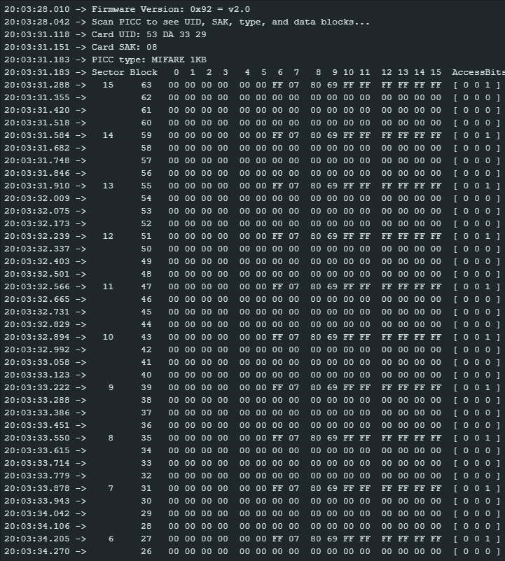 00 00 00 …, lo que significa que estaban vacíos. En el bloque 0 encontré algo así como53 DA 33 29 93 08 04 00 62 63 64 65 66 67 68 69, lo que corresponde a UID + datos de fábrica + algunos bytes “libres”.